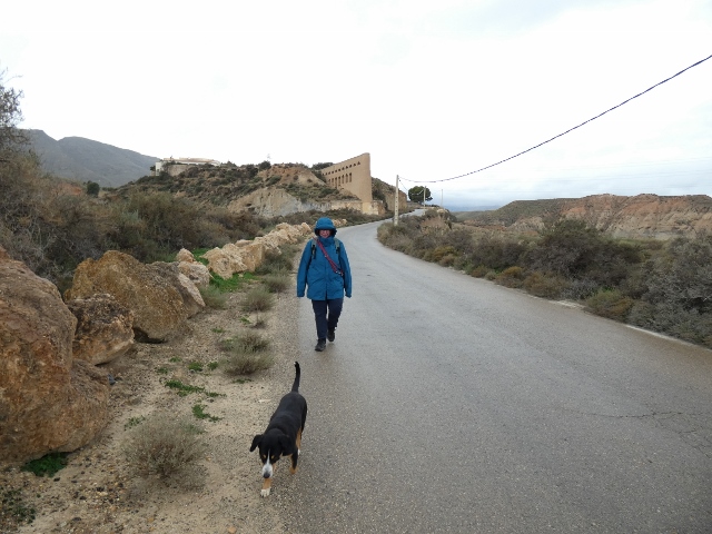 Und so fahren wir am Mittwoch bereits, voll ausgerüstet, zur Route 66. Ein Restaurant bzw. ein im Bau befindlicher Stellplatz nahe bei Tabernas. Hier gibt es zwar kein Strom, kein Trinkwasser, keine Dusche und auch keine Waschmaschine (alles und noch mehr im Bau), aber wir können ja auch ein paar Tage autark stehen. Irgendwie hat uns aber das «Texasfieber» (Grippe) erwischt und wir Zweibeiner brauchen drei Tage um uns auszukurieren. Danach erledigen wir aber nötige Reparaturen und Anpassungen an unserem Wohnkoffer. Standortmässig gefällt es uns auf der Route 66 besser. Mehr Wege um zu spazieren, mehr (ebener) Platz, ein Restaurant mit Livemusik, näher bei Tabernas und die Berge im Blick.